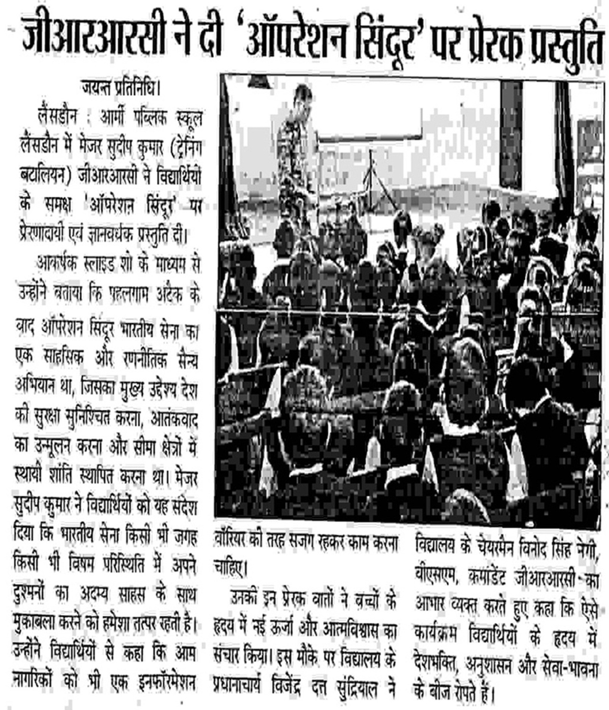 On 23 May 2025, under the aegis of GRRC, a comprehensive Disaster Management lecture and fire-fighting demonstration was organized at the school for students and staff. The session was led by Lt. Col Vijay Tomar and his team, who delivered an insightful lecture cum presentation focusing on disaster management, preparedness, response, and mitigation strategies.