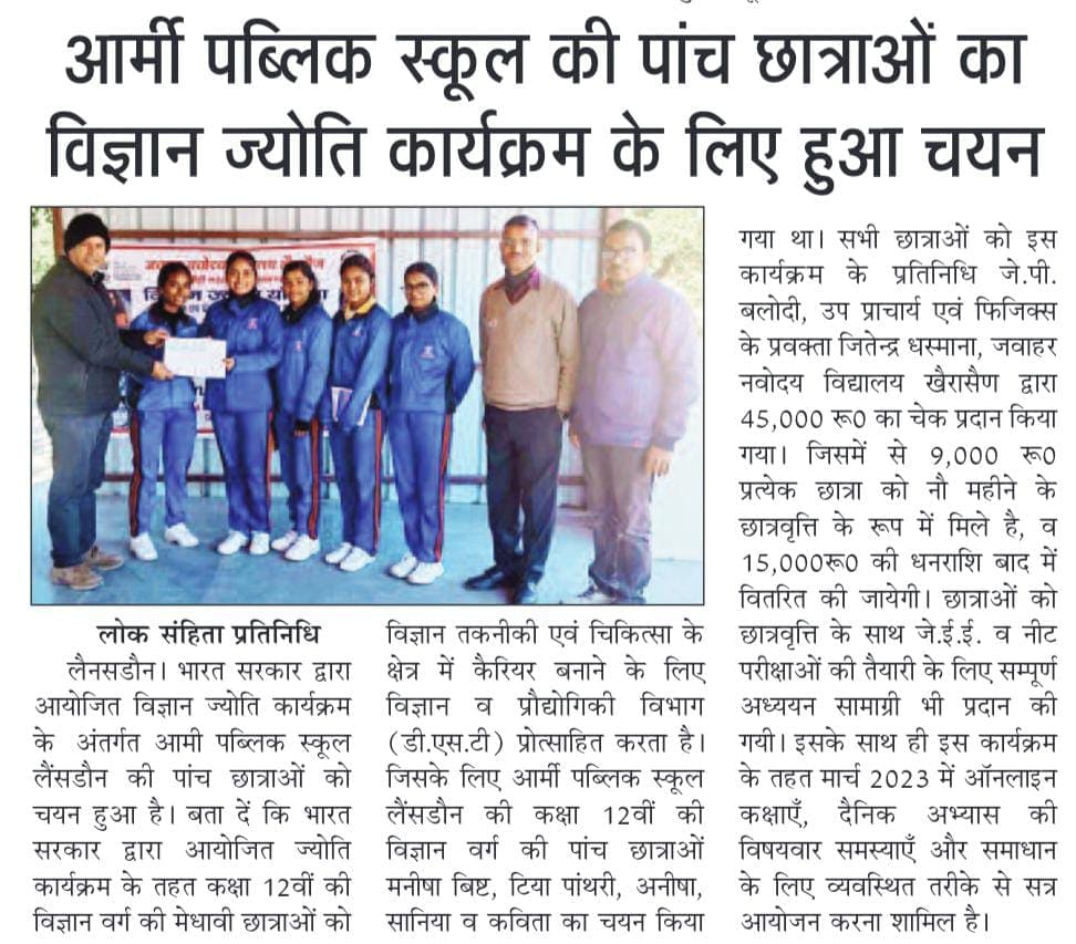 1. Pleased to inform your honour that based on the performanes in class 11th, our five meritorious girls students have been selected for scholarship under the Central Govt program "Vigyan Jyoti".