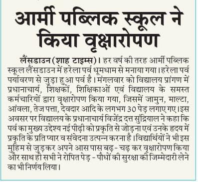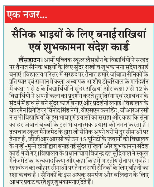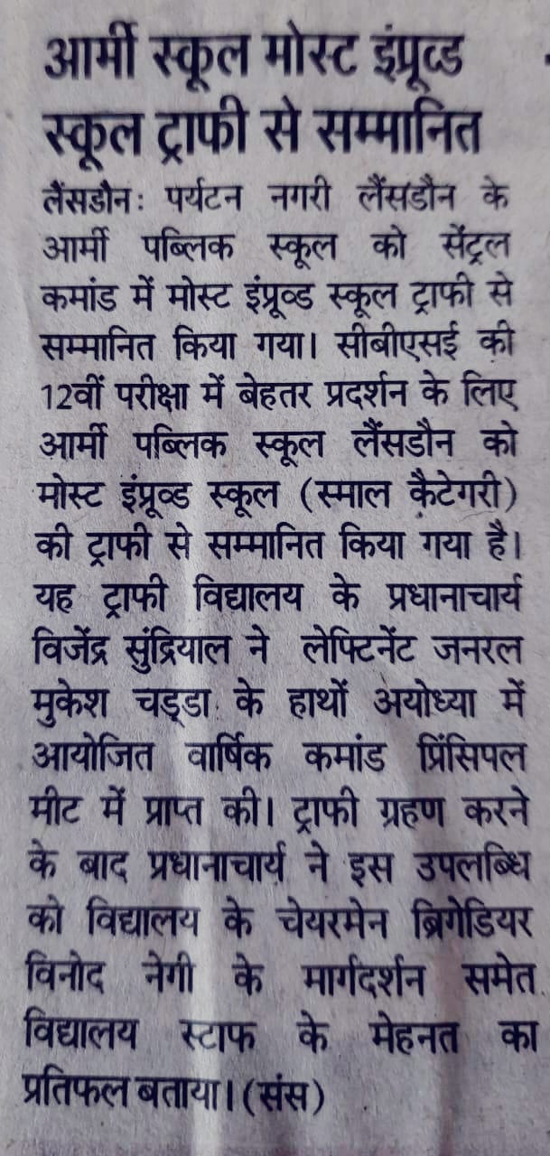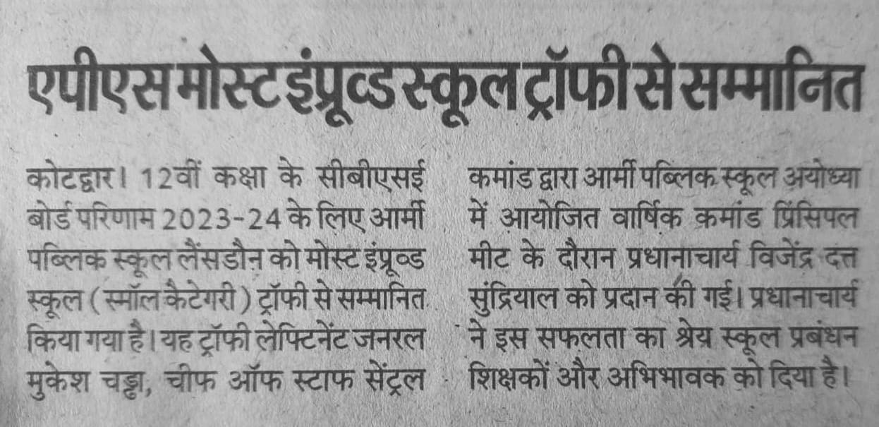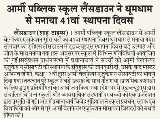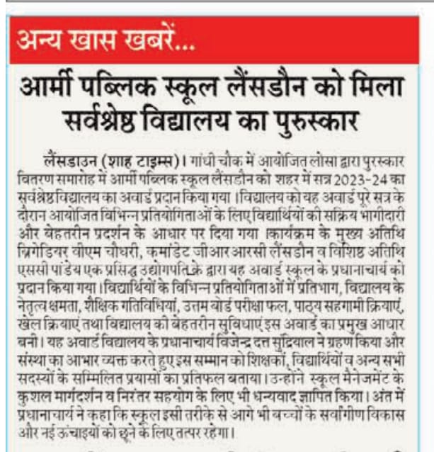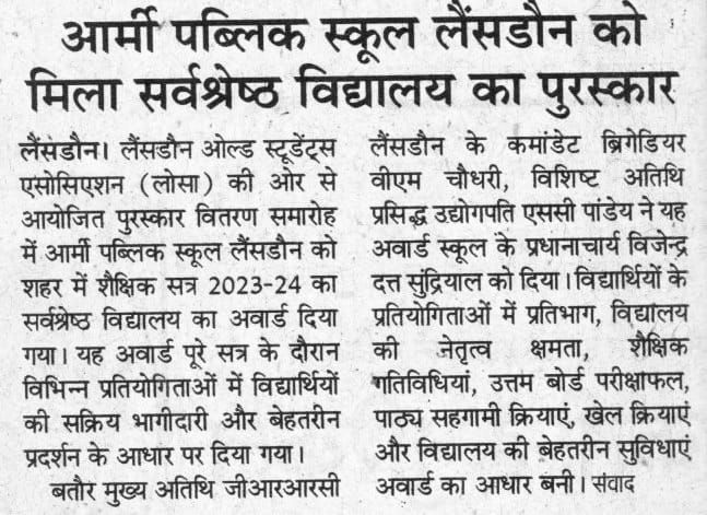 ADMISSIO0N OPEN FOR SESSION (2026-27) click here to download Interview Schedule of LSB 2026 be held at APS NO 1 Roorkee click here to check Selection of teaching staff for session 2026-27 Click here for download GUIDELINES FOR LSB 2026-27 click here to download Health Examination Camp at School View Event. Disaster Management Lecture and Fire Fighting Demonstration Conducted at School View Event. Street Play on Water Depletion Highlights Urgency of Conservation at School Assembly View Event. Inter-School Hindi Debate Competition at APS Lansdowne Sponsored by Lansdowne Old Students Association (LOSA) View Event. Mother’s Day Celebration at School View Event. Informative Session on Child Safety, Cyber Security, POCSO, and Drug Abuse Prevention at APS Lansdowne View Event. Counselling Sessions Conducted at School on 25 Apr View Event. Celebration of World Earth Day on 22 Apr View Event. World Health Day was observed on 7 April 2025 View Event. Martial Arts and Self Defense Camp Ceremony View Event. Most improved APS View Event. TENDER NOTICE click here to check