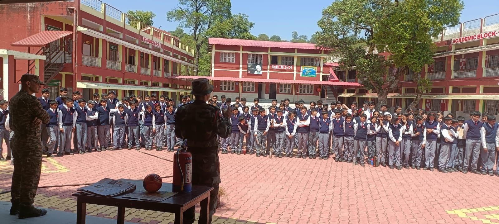 On 23 May 2025, under the aegis of GRRC, a comprehensive Disaster Management lecture and fire-fighting demonstration was organized at the school for students and staff. The session was led by Lt. Col Vijay Tomar and his team, who delivered an insightful lecture cum presentation focusing on disaster management, preparedness, response, and mitigation strategies.